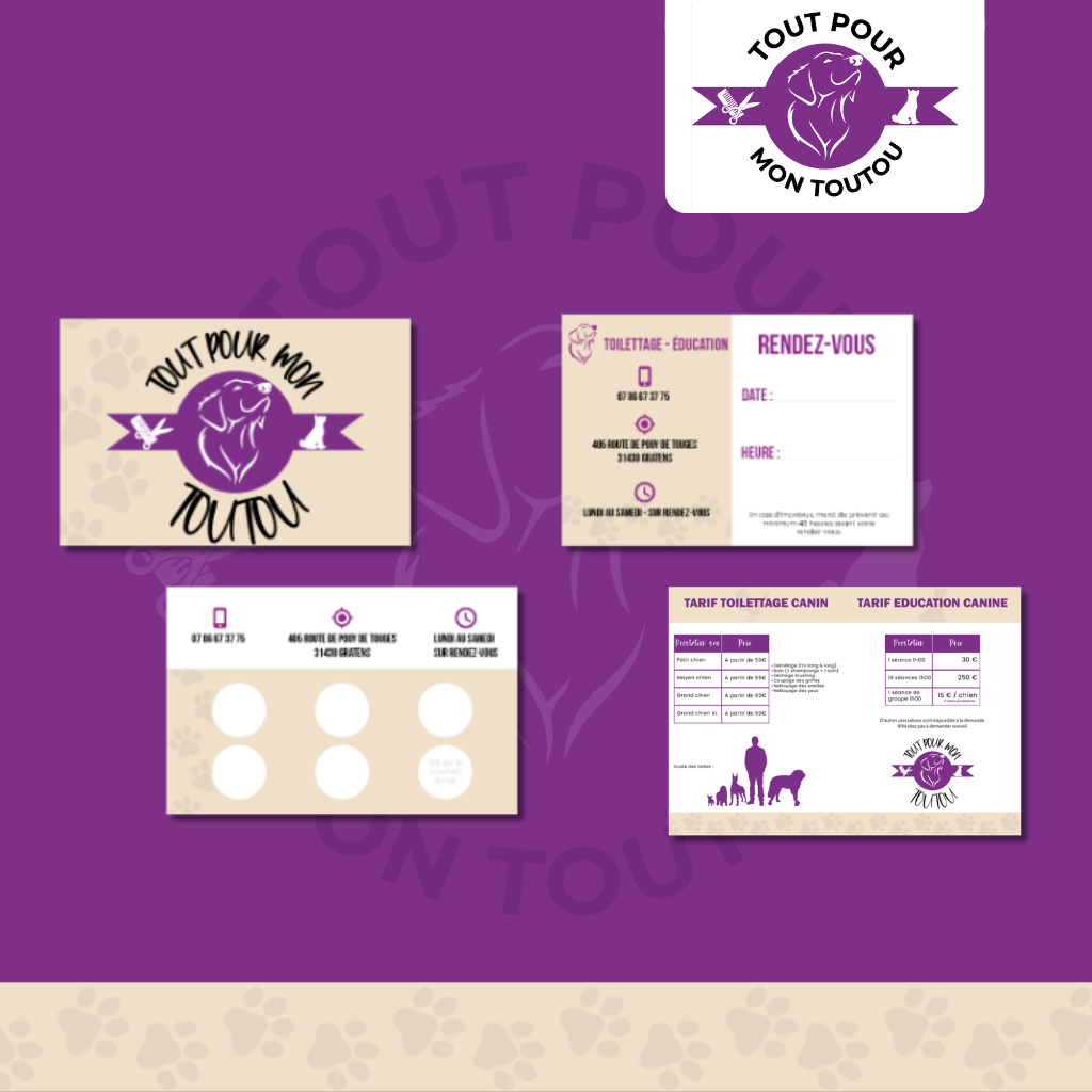 Réalisation de flyers et de cartes de visite et de fidélité pour une activité d’entretien et de dressage canin.